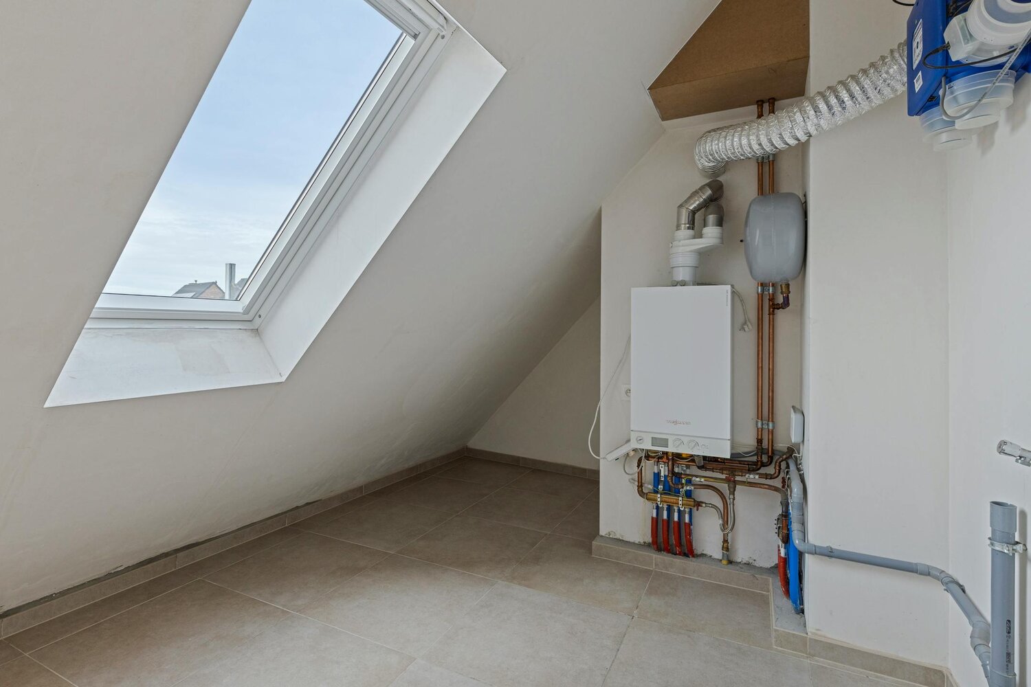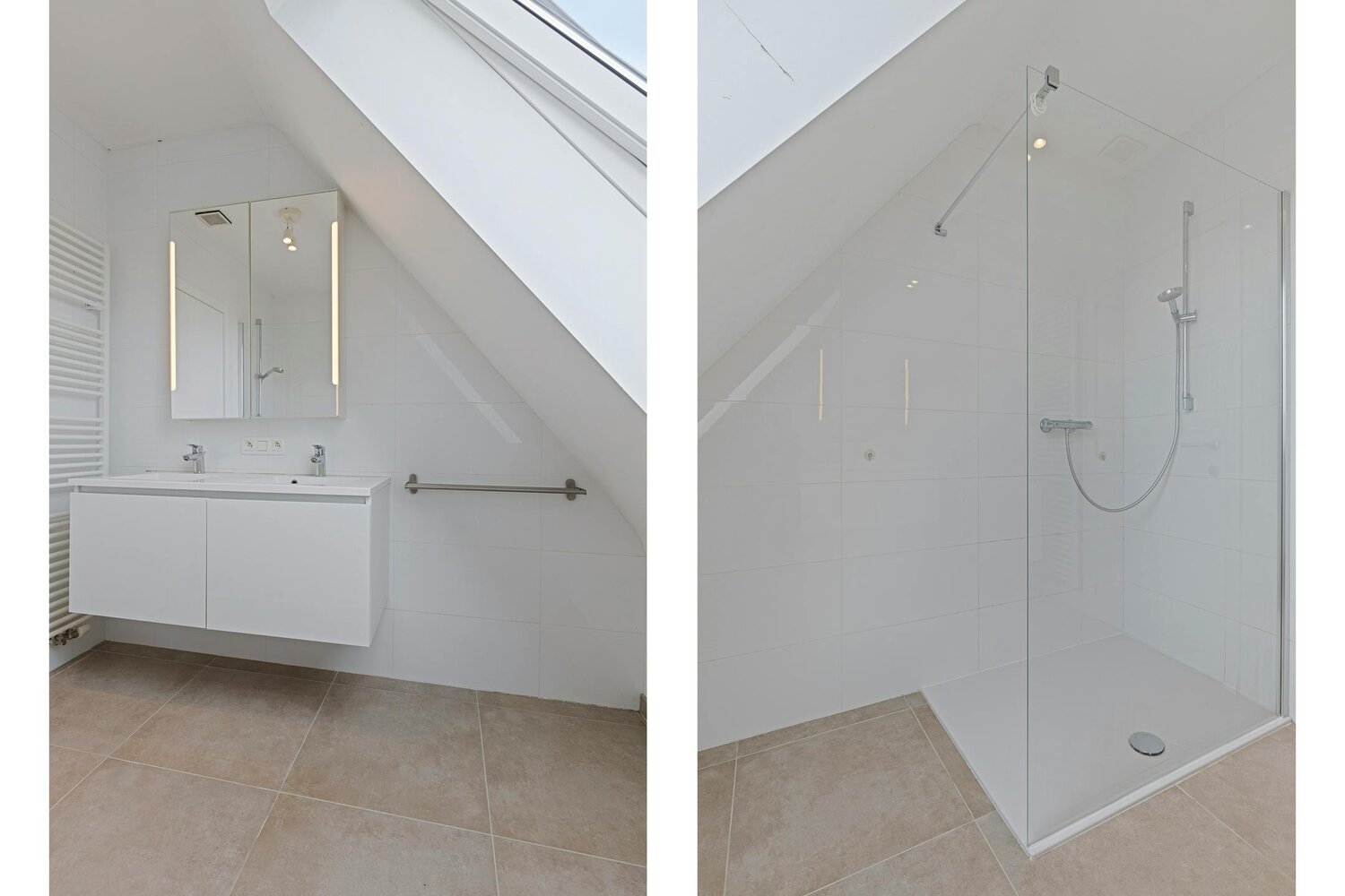 De badkamer is modern afgewerkt met een inloopdouche, dubbel wandmeubel en handdoekdroger. Er is ook een apart toilet met handenwasser voorzien voor extra comfort.
