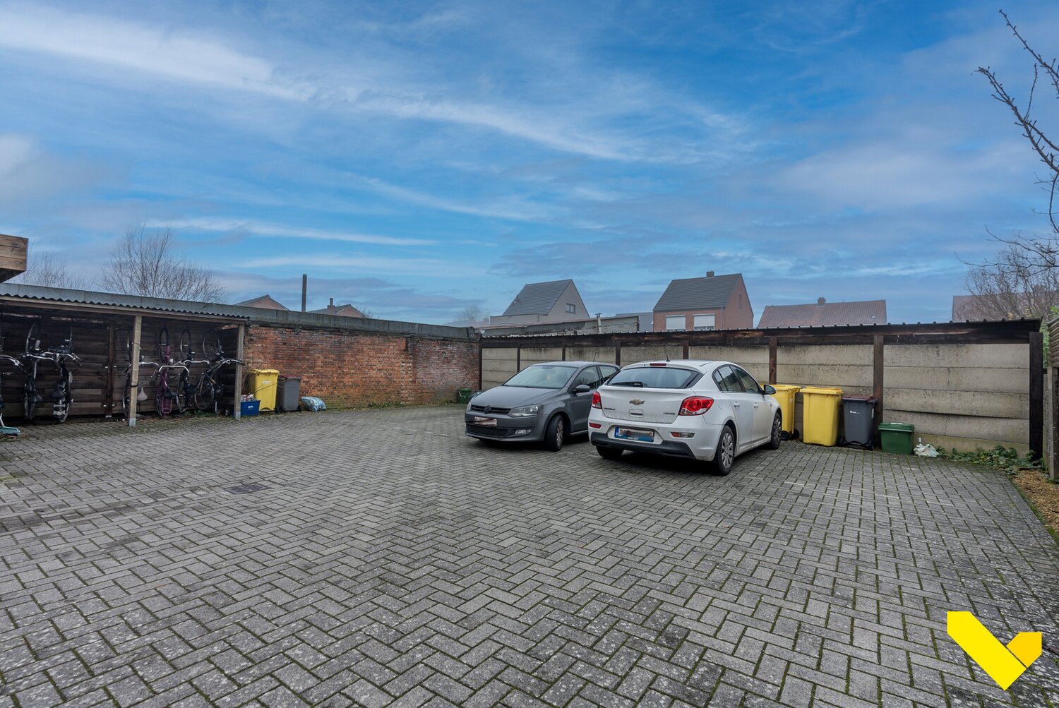 Achteraan het gebouw is er een gemeenschappelijke fietsenberging en een autostaanplaats, inbegrepen in de prijs.