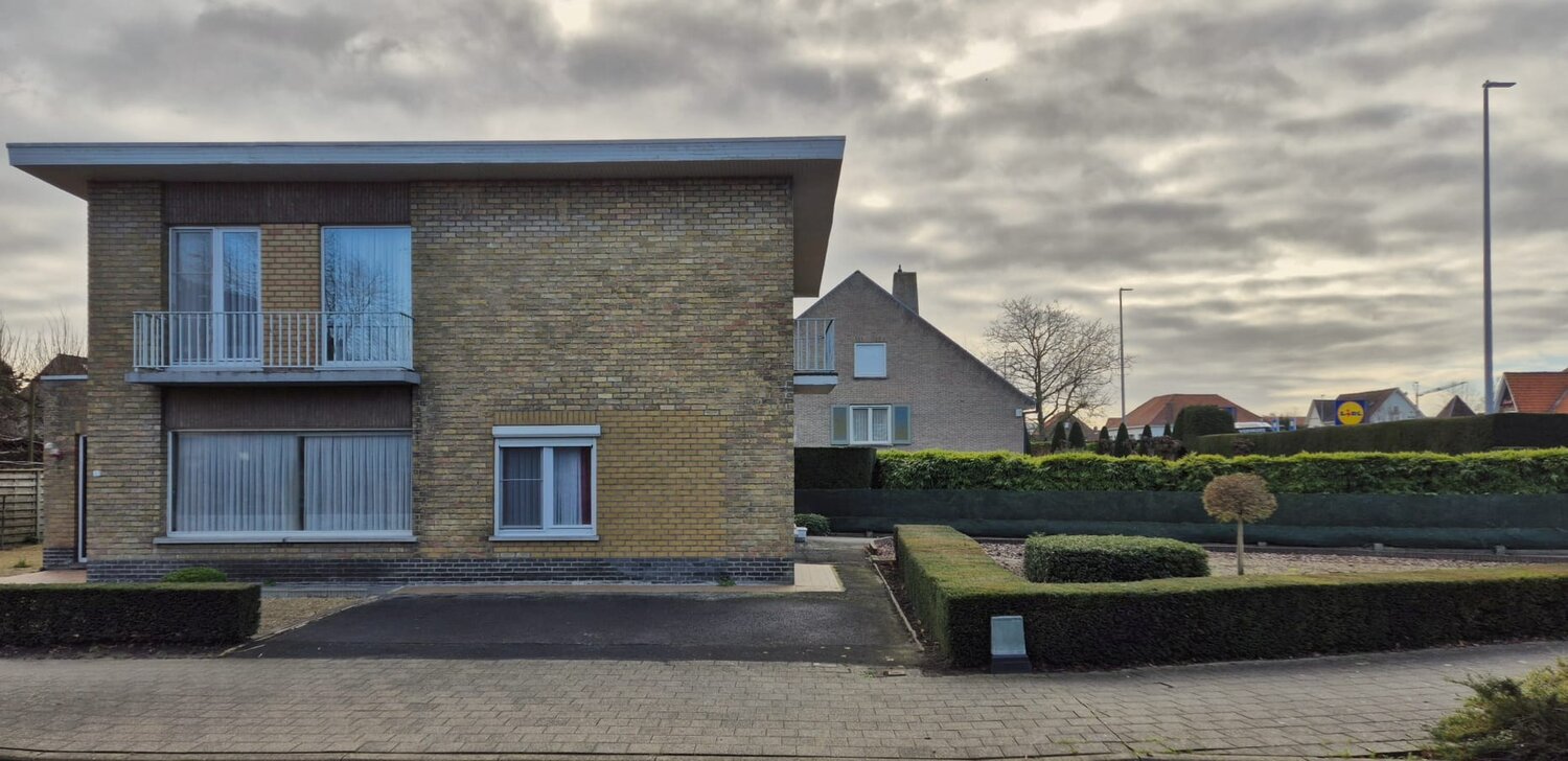 Op de hoek van de Torhoutsesteenweg met de Sint-Elooistraat ligt deze modernistische vrijstaande woning en voormalige dagbladhandel uit 1962 op een ruim perceel van 542m² met een grote oprit en aparte parking.
