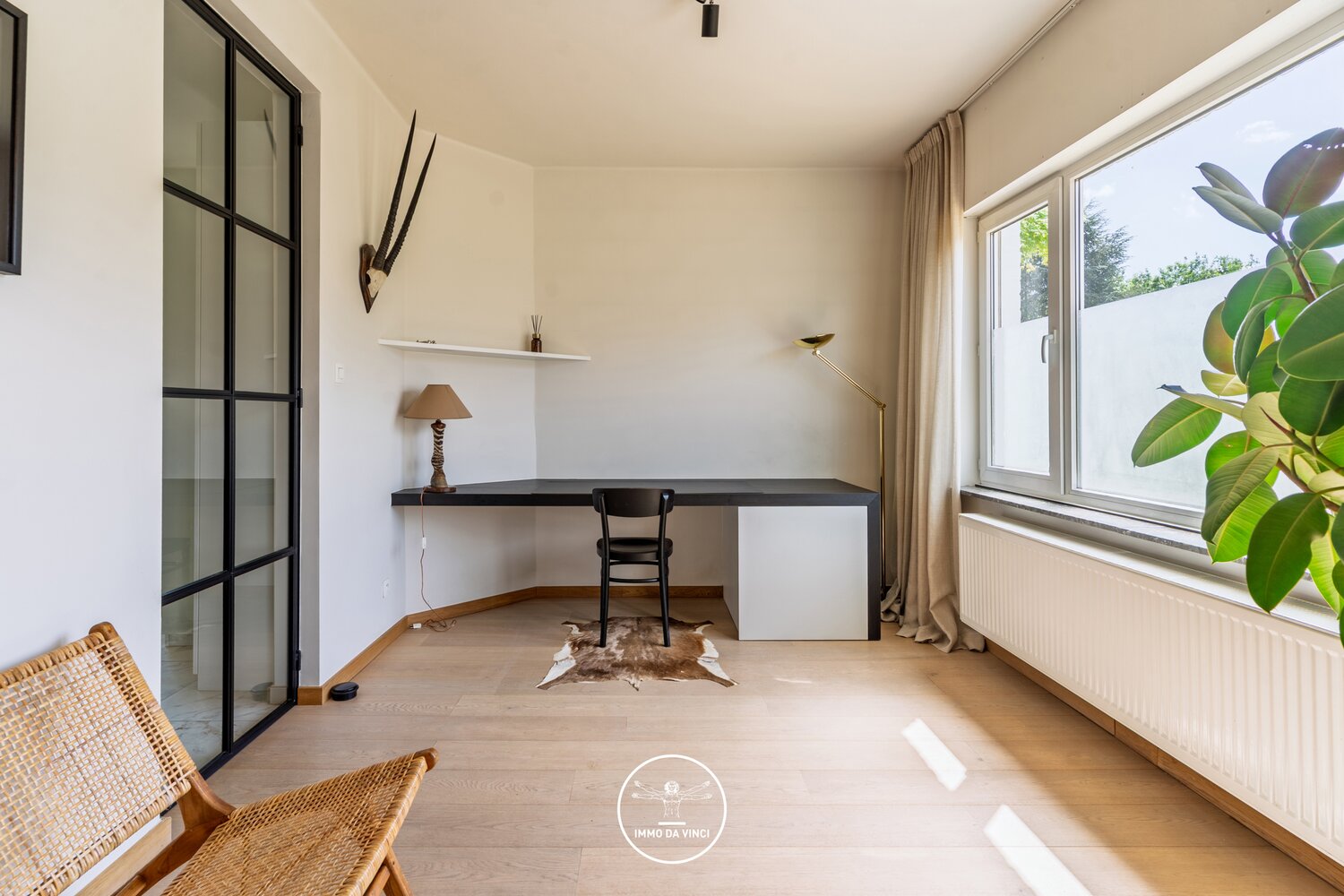 U komt binnen via een centrale inkomhal met gastentoilet. Van daaruit heeft u toegang tot de open, lichtrijke leefruimte, momenteel ingericht met een gezellige zithoek, bureauruimte en eetplaats. De volledig uitgeruste keuken met zicht op de tuin staat in verbinding met de woonkamer. Aansluitend vindt u een praktische berging en een kelder met extra opslagruimte.