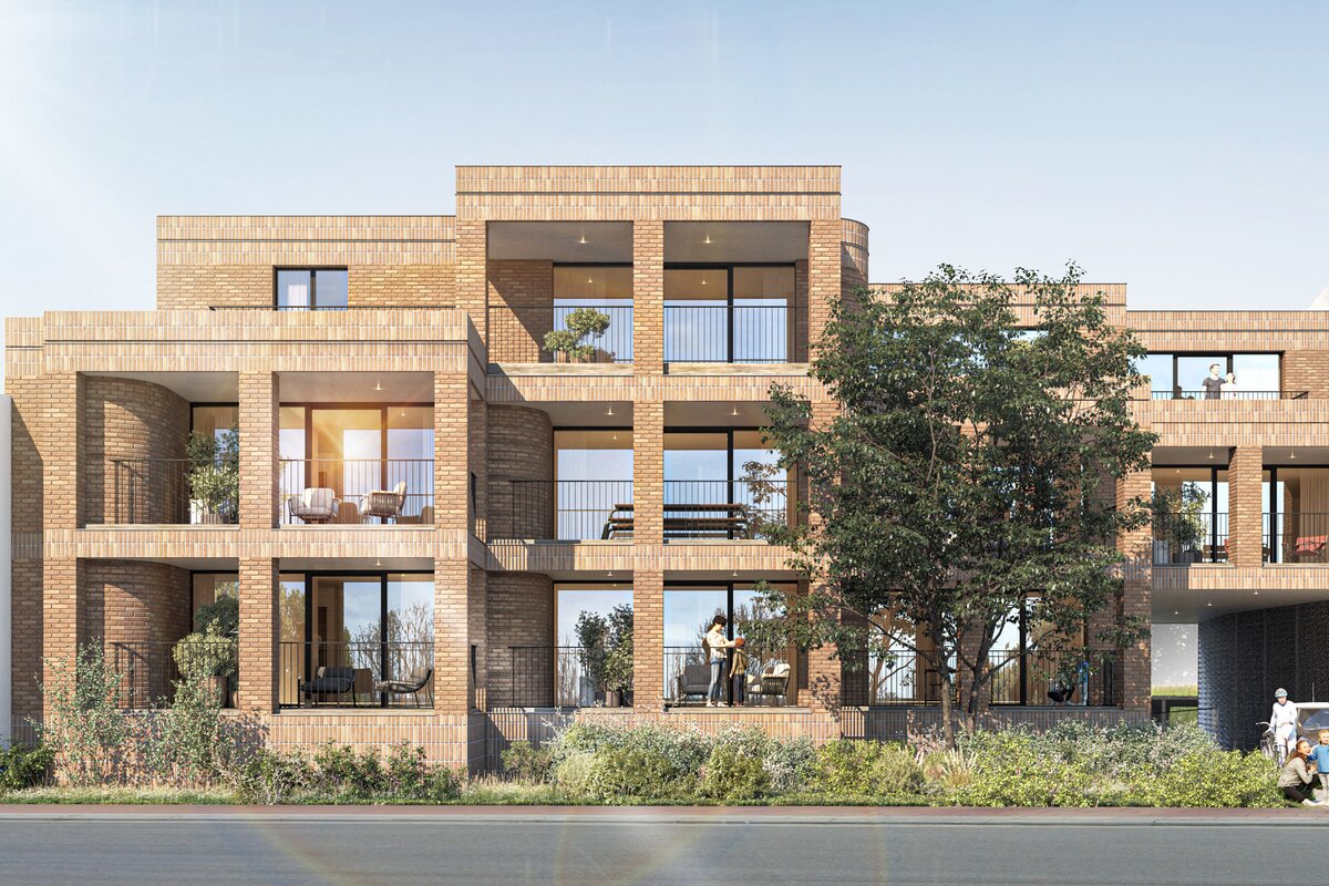 Het stijlvolle ontwerp van CAAN Architecten combineert lichte gevelstenen, slank schrijnwerk en inpandige terrassen voor een luchtige uitstraling. De gemeenschappelijke carport met groendak versterkt het groene karakter van de omgeving.