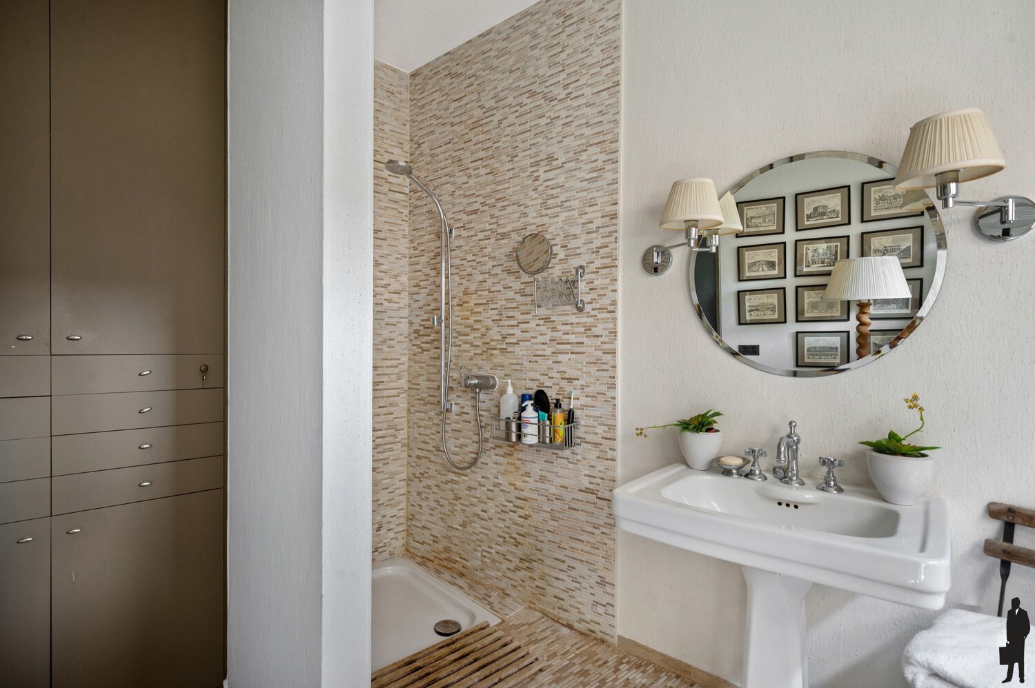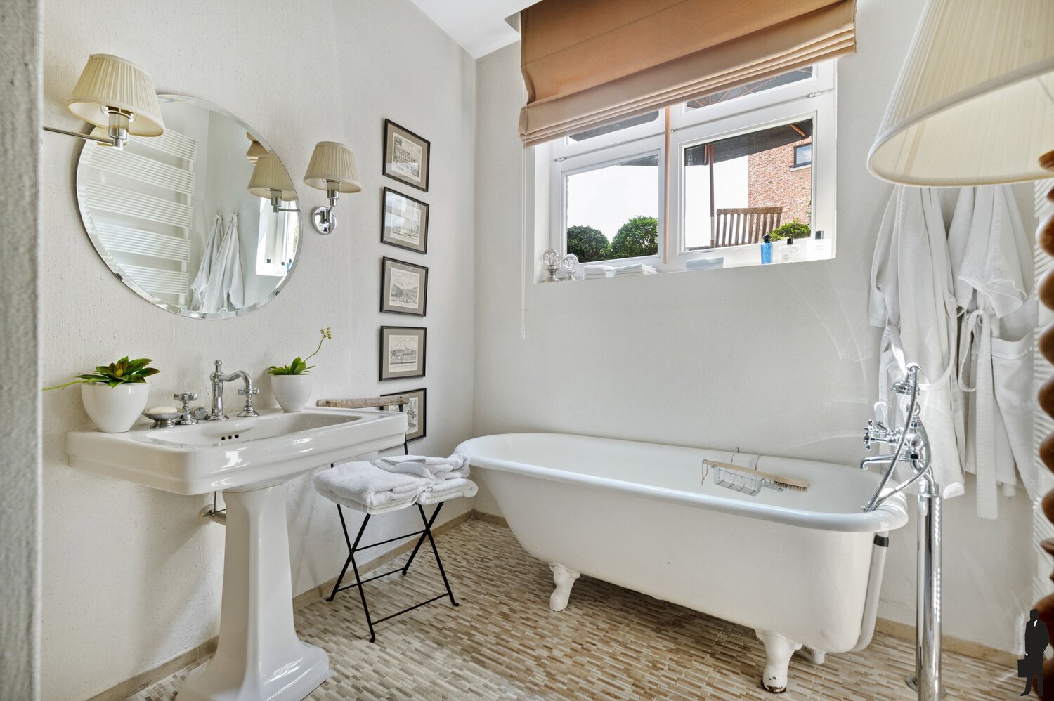 De lichte badkamer - met ligbad, inloopdouche en een stijlvolle wastafel - is een oase van rust.