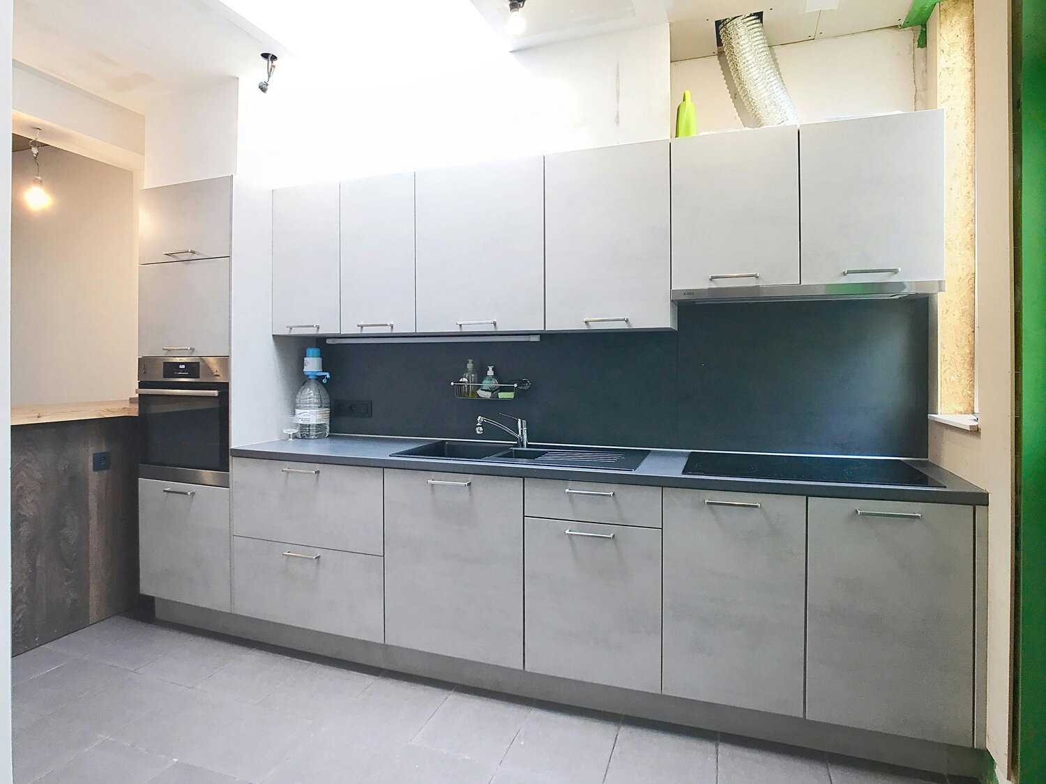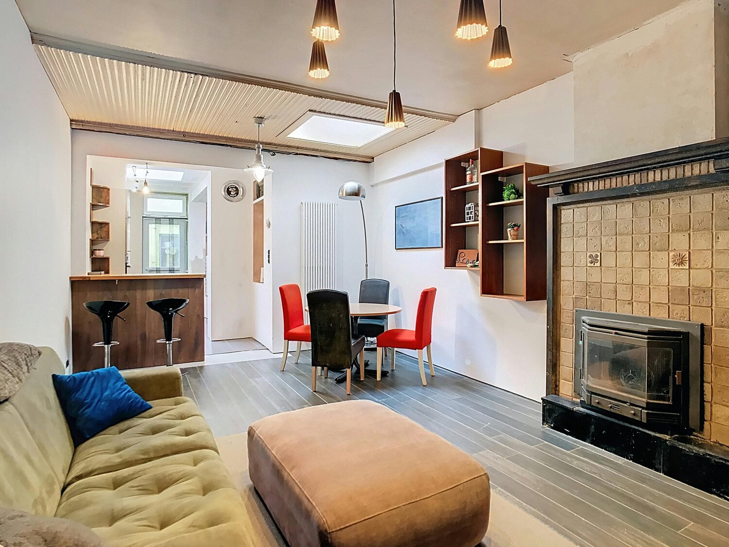 Gelijkvloers: inkomhal, gezellige woonkamer met inbouwcassette, open keuken met oven en inductiekookplaat, badkamer met douche en toilet, extra ruimte als bureau, berging of slaapkamer.