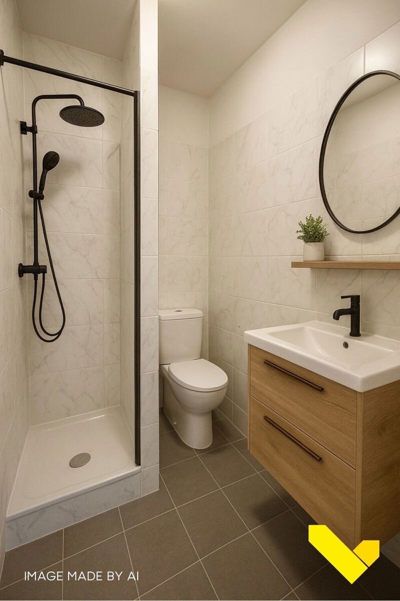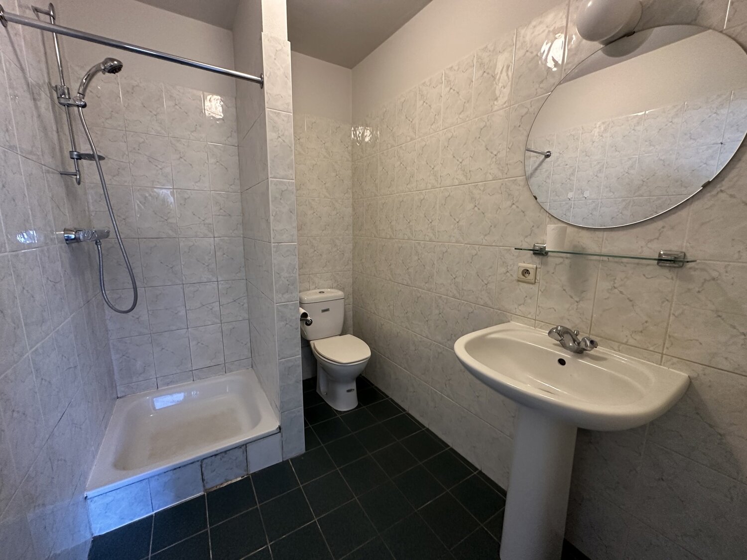 Een badkamer bevindt zich in een aparte ruimte en beschikt over lavabo, douche en toilet. Een technische berging geeft de aansluitingen voor een wasmachine.