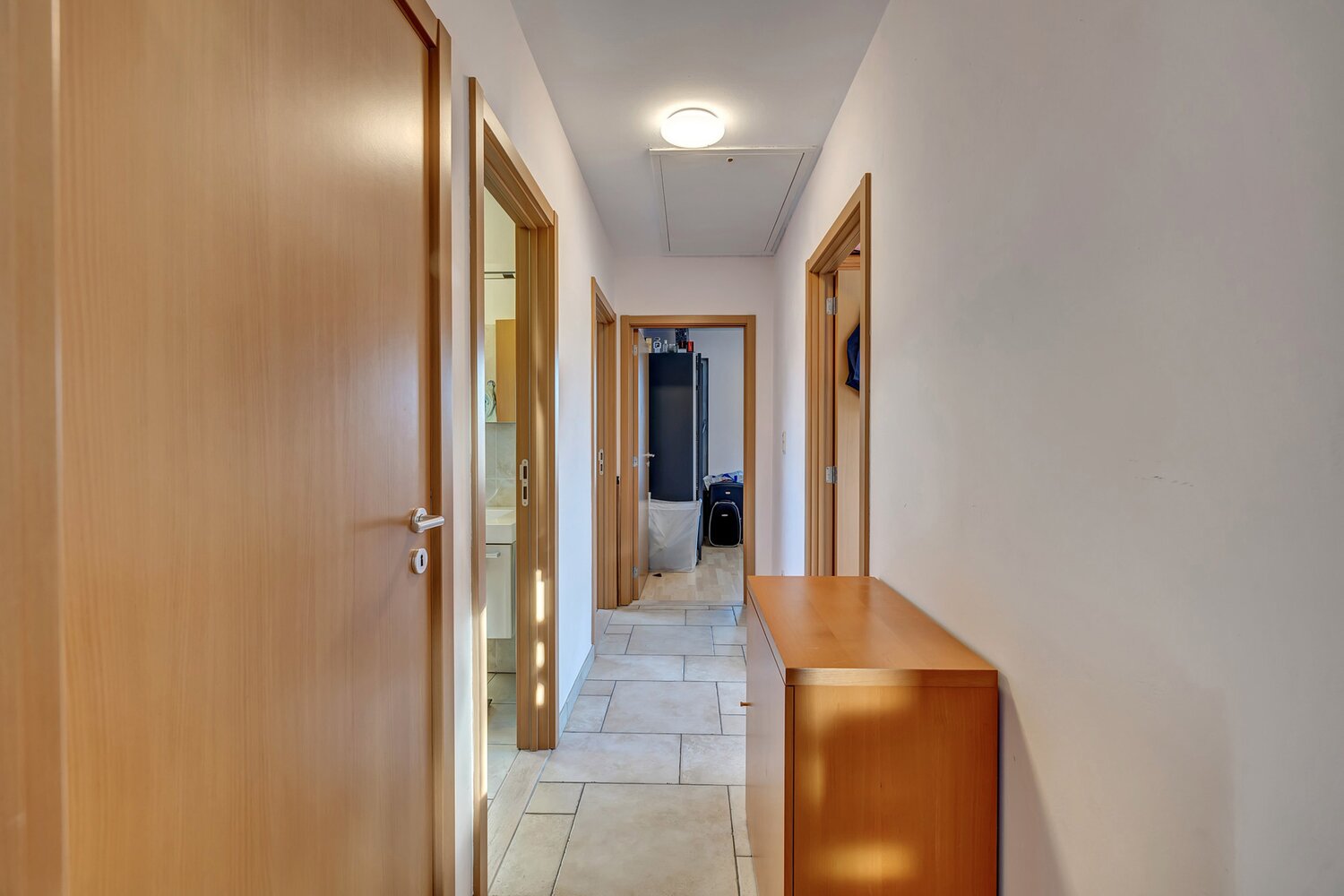 Binnenkomen doe je via de aparte inkomhal met gastentoilet. Vervolgens vind je de ruime, lichtrijke woonkamer met salon en een open, volledig geïnstalleerde keuken met aansluitend een bergruimte/wasplaats.