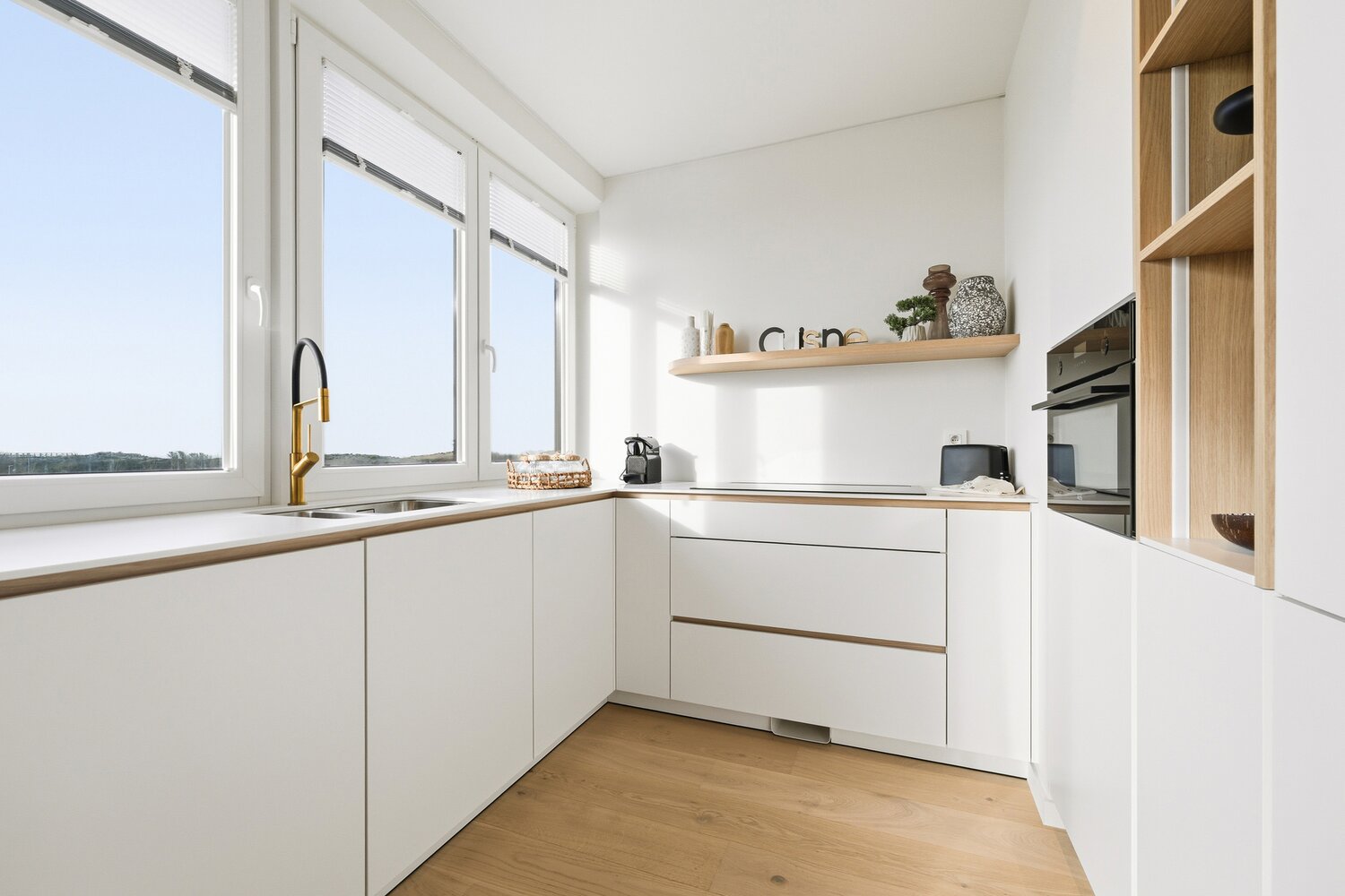 De stijlvolle leefruimte straalt warmte en gezelligheid uit dankzij de mooie parketvloer en hedendaagse afwerking. De volledig vernieuwde keuken combineert een moderne uitstraling met praktisch comfort en sluit naadloos aan op de leefruimte.
